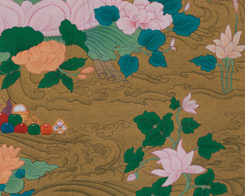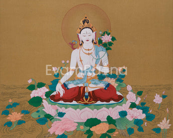 The thangka's background is decorated with soft golden hues, an abundance of lotus blossoms, and growing plants, all of which represent beauty, knowledge, and spiritual awakening. The Karma Gadri style aims to create a calm, celestial atmosphere, characterized by its expansive layout and flowing floral details. This composition not only enhances White Tara's spiritual presence but also creates a peaceful and serene visual experience.
