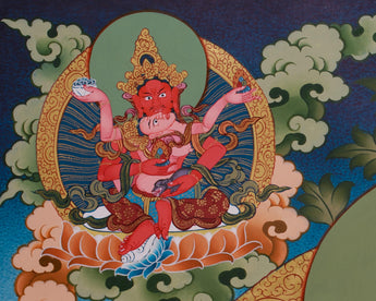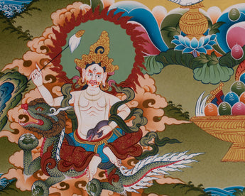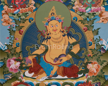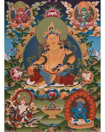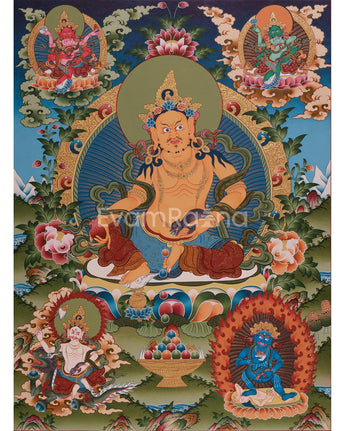 Dzambhala, the Buddhist deity of prosperity, is revered in Tibetan and Himalayan traditions for eradicating poverty and providing material and spiritual abundance. Yellow Dzambhala sits in the center, radiating royal power and kindness as he holds the mongoose that spews precious stones, a symbol of boundless wealth. His four powerful forms surround him, artfully arranged around a scene filled with lotuses, clouds, and mystical offerings. Each deity is depicted dynamically, surrounded by vibrant imagery such as flaming halos, tranquil clouds, or wrathful auras, emphasizing their roles as protectors against poverty and spiritual decay. Whether in a meditation area, home altar, or as decorative elements, it serves as a reminder of the generosity and abundance that come from practicing compassion and mindfulness.