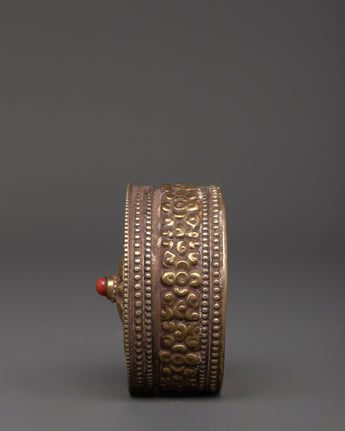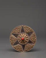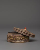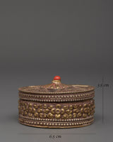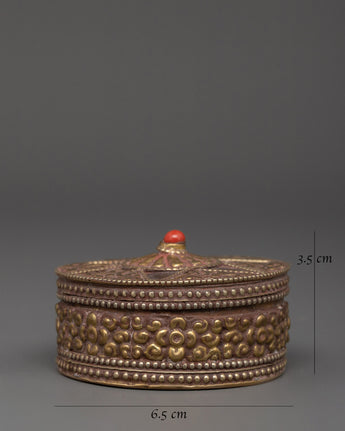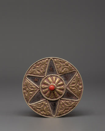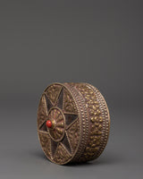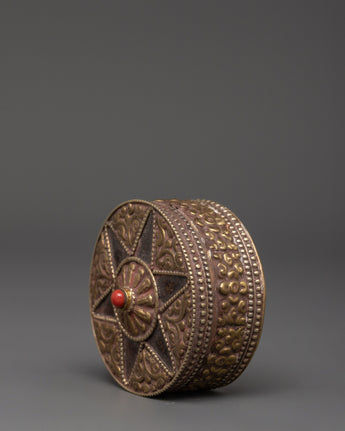 This handcrafted treasure box made of brass and copper has a star-shaped design in the center, encircled by a circular pattern, and a coral bead in the middle. Inspired by Tibetan creativity, this exquisite box stands 3.5 cm tall, has a 6.5 cm base, and weighs 0.076 kilograms.  It is embellished with delicate floral carvings that evoke traditional Tibetan ingenuity, and the artificial coral inlay adds both beauty and symbolic significance. This bright box is ideal for holding jewelry, prayer beads, and sacred offerings, and it also makes an excellent altar ornament, spiritual keepsake, or home decor piece.
