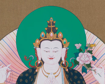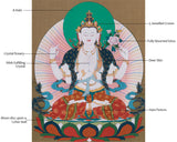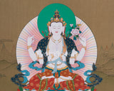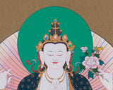 The Thangka depicts Avalokiteshvara in a vajra posture, seated on a lotus seat, symbolizing purity and transcendence. His front hands are clasped in a prayerful gesture, holding a wish-fulfilling crystal, while his lower right hand holds a crystal rosary, representing his continuous compassionate activity. The lower left hand delicately cradles a blooming lotus, a symbol of purity arising from the depths of samsara. His five-jeweled crown and halo further signify his enlightened status, while his white, radiant form conveys purity and boundless love.