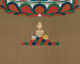 The Karma Gadri style, originating from the Karma Kagyu lineage, is renowned for its delicate lines, spacious composition, and harmonious integration of the divine figure with serene landscapes. This artistic approach brings a balanced, calming presence to the artwork, emphasizing the spiritual depth while maintaining a visually soothing aesthetic.