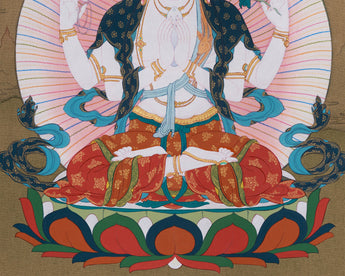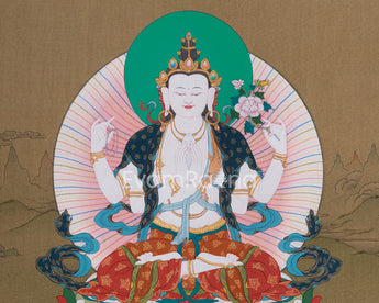 Experience the timeless essence of peace with the Four-Armed Avalokiteshvara, the Bodhisattva of Infinite Compassion. This hand-painted thangka captures his serene and enlightened presence, revered in Vajrayana Buddhism as Chenrezig. The artwork was meticulously created on premium cotton canvas, utilizing rich acrylic colors and embellished with gold coloring. It is not just a beautiful work of art; it is an invitation to surround oneself with the compassionate blessings and guidance of Avalokiteshvara.