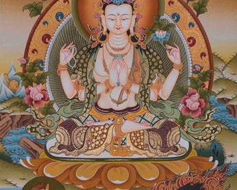 Chengrezig Thangka is adorned with intricate details and vibrant colors, making it a beautiful decorative piece and a spiritual tool for meditation spaces, homes, or offices. It invites viewers to cultivate these essential qualities in their lives, making it a cherished addition to any collection.