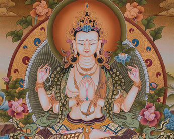 The "Guardian of Compassion: Four-Armed Chenrezig Thangka Featuring Manjushri and Vajrapani" is a Tibetan Buddhist art piece that symbolizes compassion, wisdom, and strength. The central figure is the Four-Armed Chenrezig, the Bodhisattva of Compassion, with his four arms symbolizing his boundless ability to help all beings. The upper two hands are joined in a prayer mudra, holding a wish-fulfilling jewel, while the other two hands hold a crystal rosary and a lotus flower, symbolizing purity and the continuous cycle of prayer. The thangka is flanked by Manjushri, the Bodhisattva of Wisdom, holding a flaming sword and a scripture representing transcendent wisdom, and Vajrapani, the Bodhisattva of Power, holding a vajra symbolizing his role in removing obstacles and providing strength to practitioners.