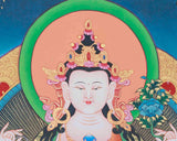 The Four-Armed Chenrezig Thangka is a Tibetan Buddhist art piece that symbolizes the compassionate nature of Avalokiteshvara, the Bodhisattva of Infinite Compassion. The deity is depicted with four arms, symbolizing his ability to help all sentient beings. He is seated on a lotus throne, symbolizing purity and spiritual awakening. Chenrezig's serene expression conveys boundless compassion, while his upper hands hold a wish-fulfilling jewel and a mala, representing his vows and prayers. The lower hands are in a gesture of compassion and holding a lotus, symbolizing purity.