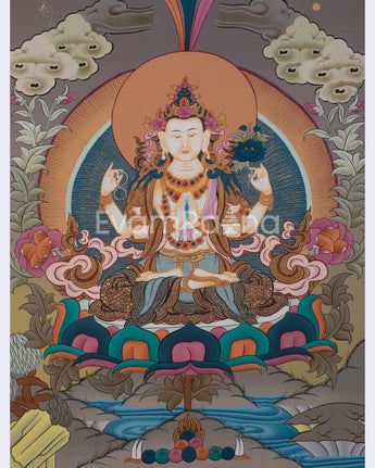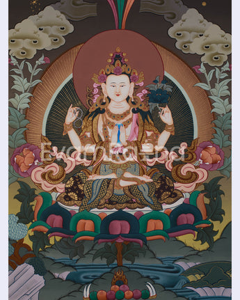 This four-armed compassionate Chenrezig thangka is a beautiful hand-painted depiction of the Bodhisattva of Compassion, also known as Avalokiteshvara. The artwork is painted on high-quality cotton canvas, showcasing the harmonious balance of traditional Tibetan artistry and spiritual symbolism.