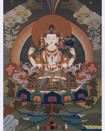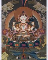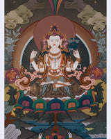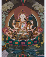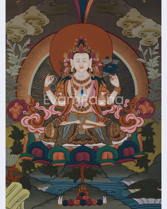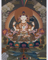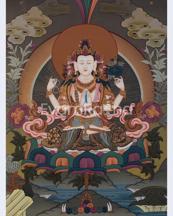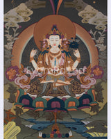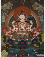 Four Armed Compassionate Chenrezig Thangka | Hand-Painted Compassion Deity Art