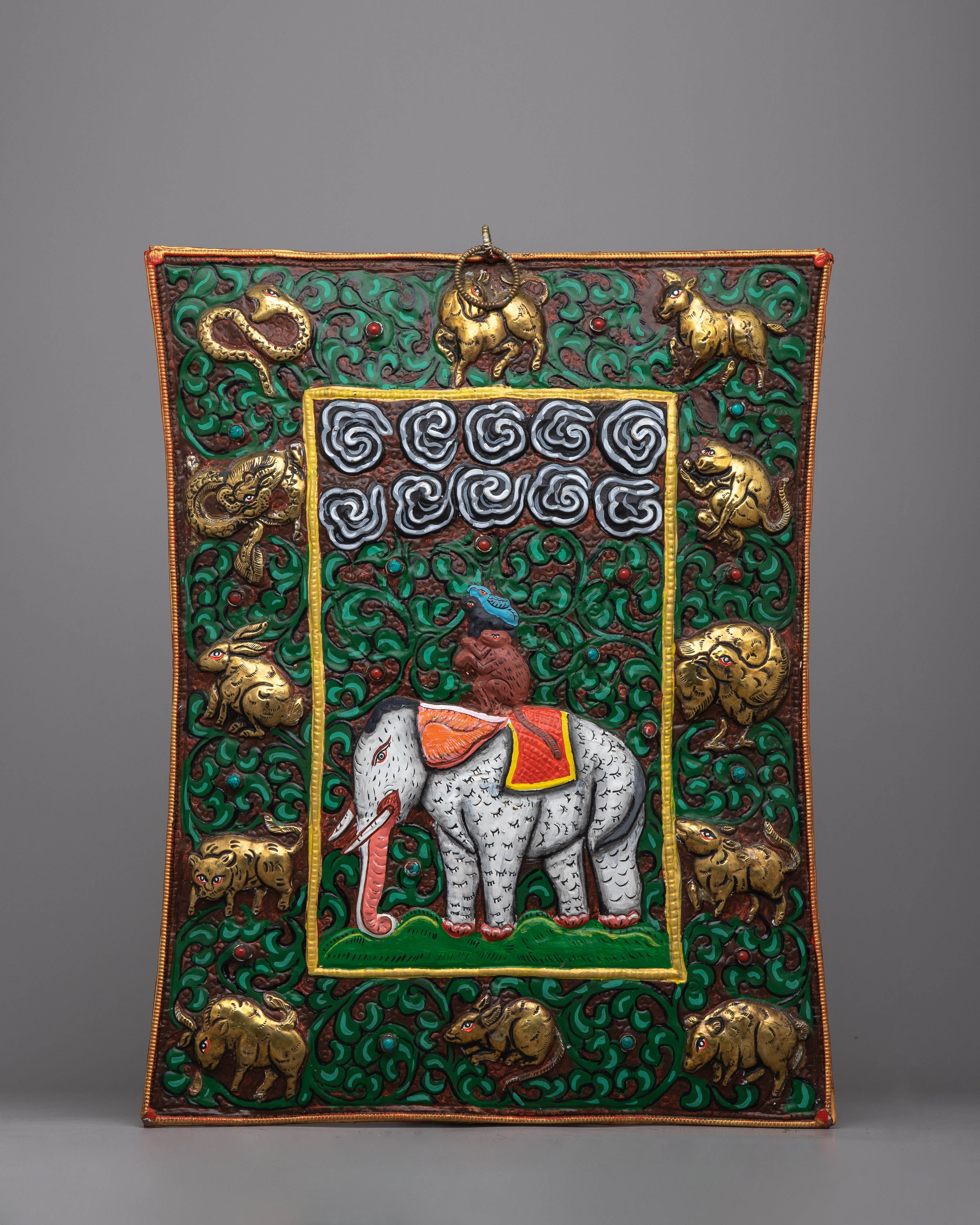 The thangka, which depicts the Four Harmonious Friends, a common subject in Buddhist iconography that stands for collaboration and harmony, serves as a reminder of the value of harmony and respect for others. Its brass body makes it a striking center point in your house or place of business, adding a touch of sophistication and elegance to any area.
