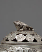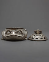 Our burner is a very high-quality silver plated Tibetan incense burner, handcrafted from brass in a traditional style, silver plating is done by an electroplating process. The unique frog design makes this craft a very special display.