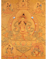The Thangka is meticulously hand-painted using pure 24K gold, enhancing its sacredness and magnificence. Each stroke of gold imbues the thangka with a divine luminosity, elevating the spiritual potency of Vajrasattva's presence. This use of gold not only honors the divine qualities of Vajrasattva but also serves as a powerful symbol of purity and transcendence.