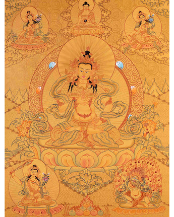Introducing our magnificent Full Gold Vajrasattva Thangka, a radiant embodiment of purity and enlightenment depicting Vajrasattva, revered as the quintessence of pristine purity and enlightened consciousness in Tibetan Buddhism, graces this thangka with his divine presence. With an aura of serene compassion, Vajrasattva sits in the posture of meditation, holding a vajra (diamond scepter) in his right hand and a bell in his left, symbolizing the inseparable unity of wisdom and compassion.