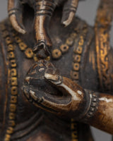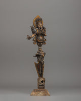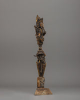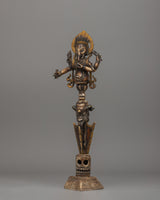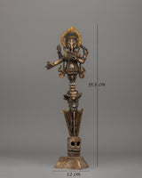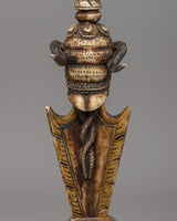 The symbolism of this Ganesh Phurba depicts Lord Ganesha standing atop the Phurba, representing the removal of barriers and the purging of negative energy. The Makara in the center protects against spiritual perils and signifies the balance of water and land, giving purification. At its core, the wrathful deity represents the force that removes ignorance and spiritual delusion, resulting in spiritual development and empowerment. The Phurba, a Buddhist symbol of spiritual development, helps dispel illusions and establish a clear path to enlightenment. This sacred object is an excellent addition to any ritual setting, providing spiritual strength, protection, and the ability to convert negative into positive energy.