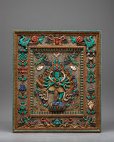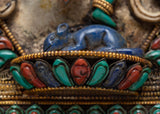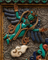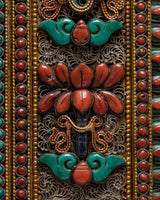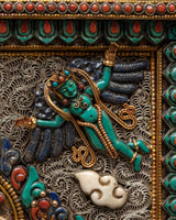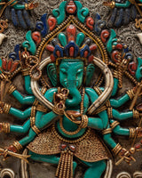 Introduction to Ganesh Square FrameYou may want to choose this Ganesha frame for your Buddhist home furnishings. It is unique in its type and will completely change how your wall appears. The border of the frame is elegantly embellished with Seku metalworking in the form of antique filigree. This wall art is unusual, especially in the context of the Newari culture, because it was created with genuine stone. The Ganesha carving in the middle of this elaborate frame is a lovely touch to this work of art.