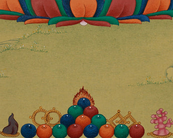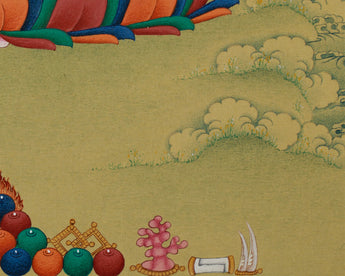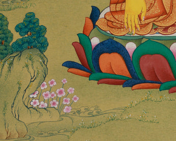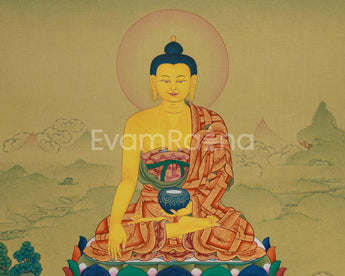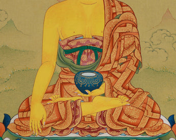 This sacred thangka of Gautama Buddha is a true reflection of Tibetan Buddhist artistry. It was created with natural Lhasa stone pigments and genuine 24K gold on fine cotton canvas. The mineral pigments, extracted from Lhasa stones, provide radiance and depth, while the 24K gold detail illuminates the Buddha's robes. The painting follows the traditional Karma Gadri style, known for its refined elegance and soft, flowing details, bringing spiritual figures to life.