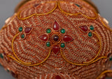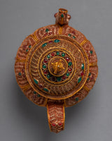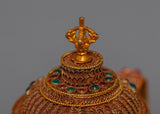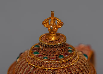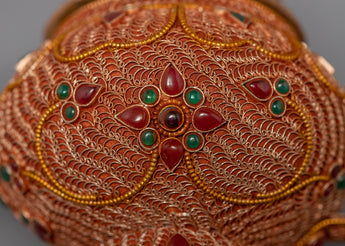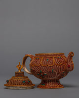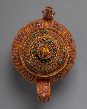 The Buddhist teapot is a one-of-a-kind work of art with a copper body and inlaid gemstones. The pot is additionally plated with 24k Gold. The intricate design of the pot is painstakingly crafted by skilled artisans, with each detail placed with care to create a beautiful and harmonious composition. The gemstones inlaid into the copper body add a layer of beauty and meaning to the pot, as each stone was carefully chosen for its spiritual properties and symbolic meaning.