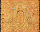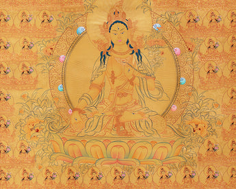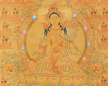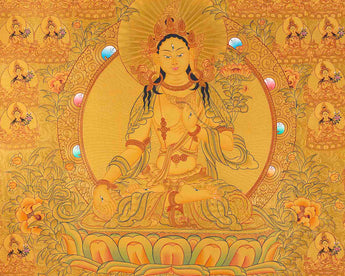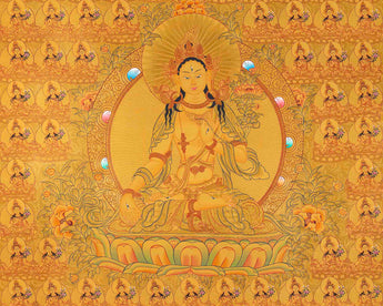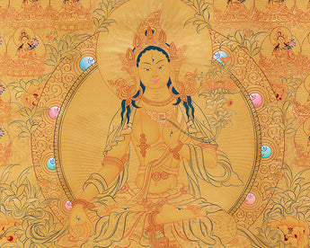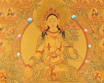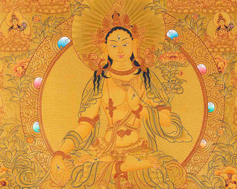 Genuine 24K Gold 108 White Tara Thangka is a stunning spiritual art piece featuring the revered deity White Tara, known as the "Mother of All Buddhas." This thangka, adorned with luminous gold, symbolizes White Tara's compassionate wisdom and long life, offering her boundless grace and protection to all beings. White Tara is depicted in her classic form, seated on a lotus throne with a radiant white body, symbolizing purity and her ability to transcend worldly attachments. Her seven eyes, two on her face and one on each palm and sole, represent her all-seeing awareness and profound compassion for alleviating suffering. Each eye symbolizes her watchful gaze over the world, ensuring that no one is left without her care.