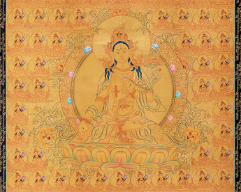 The thangka is surrounded by 108 smaller images of herself, each representing a different aspect of her compassionate energy. These intricate details highlight the boundless ways in which White Tara reaches out to assist and empower those who seek her blessings. The background of the thangka is adorned with elaborate patterns and sacred symbols, creating a divine beauty that enhances the overall spiritual ambiance.