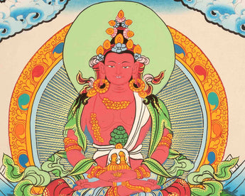 Amitayus Buddha: Amitayus Buddha, also known as Amitabha, is a celestial Buddha in Pure Land Buddhism. He represents boundless life and wisdom. Devotees believe in rebirth in the Pure Land through devotion to him. Amitayus is depicted seated, holding a vessel of nectar symbolizing immortality. His mantra is "Om Amideva Hrih.