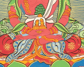 The Buddhist Thangka of Amoghasiddhi, which is hand-painted, is extremely important because it symbolizes the Buddha's enlightened attributes, which include wisdom and bravery. The thangka, which is painstakingly made with finely detailed hand-painted elements, serves as a spiritual doorway that asks followers into a world of reflection and meditation. With her calm behavior, Amoghasiddhi inspires and leads practitioners on a path of transformation wherein unfavorable feelings can be transformed into wisdom. Using the rich tapestry of Tibetan Buddhist practice, this thangka serves as a visual meditation tool that not only displays creative talent but also acts as a holy conduit for pursuing the path to enlightenment and the rewards of fearlessness. Devotees look to this heavenly artwork to gain strength and knowledge as well as to strengthen their connection with the transformational characteristics portrayed by Amoghasiddhi.