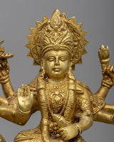 The Goddess Durga Statue is a stunning work of art that has been carefully handmade from brass. This magnificent statue depicts the strong deity sitting gracefully upon a majestic lion, representing strength and courage. She exudes fearlessness and safety with her peaceful expression and celestial presence. The goddess is clothed with gorgeous jewelry and clothes, and she holds several sacred artifacts in her six hands, each reflecting her individual traits and powers. This Goddess Durga Statue is a wonderful tribute to beauty and devotion, whether placed as a centerpiece at a shrine or as a decorative object in your house.