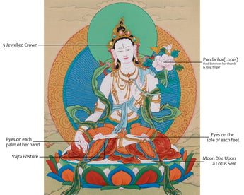White Tara, a symbol of purity and enlightenment, is seated on a lotus seat, adorned with flowing robes and traditional jewels. Her seven eyes represent her omniscient vision and ability to protect sentient beings. Her right hand extends in varada mudra, granting blessings, while her left hand holds a lotus flower, symbolizing purity and spiritual awakening.