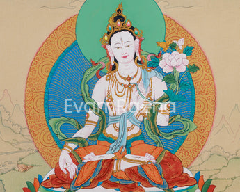 White Goddess Tara, the compassionate protector of sentient beings and revered mother of the Buddhas. White Tara is honored in Tibetan Buddhism for her swift responsiveness to the suffering of all beings, offering protection from fear and removing obstacles on the path to enlightenment. Through her boundless compassion, she provides peace, healing, and spiritual guidance.