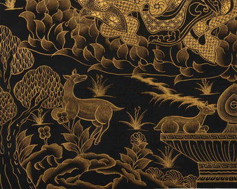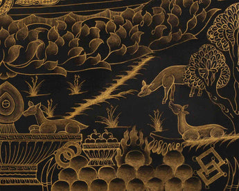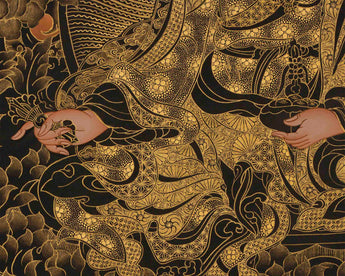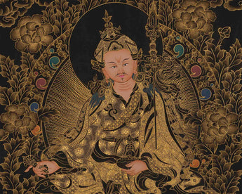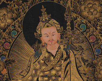 Gold and Black Guru Rinpoche Thangka is a striking piece of art that blends traditional Tibetan art with a contemporary color scheme. The thangka features the revered figure of Guru Rinpoche, also known as Padmasambhava, symbolizing his enlightened nature and role in establishing Buddhism in Tibet.