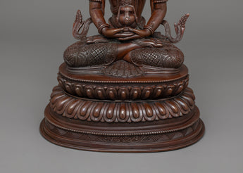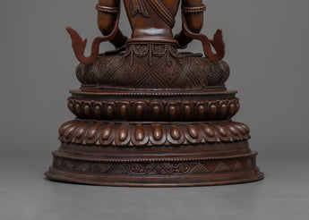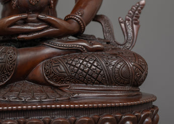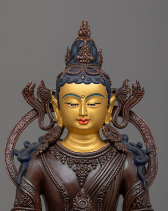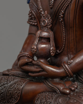 He is carrying a long-life vase filled with amrita while sitting on a double lotus seat in a vajra stance. He is one of three great and important long-life deities. The highlight of the statue is the intricate hand-carving of the statue, the jewels, clothes, and the crown.