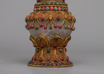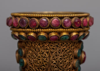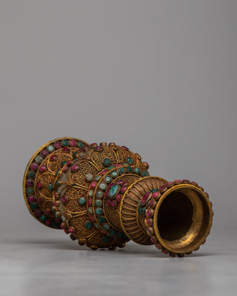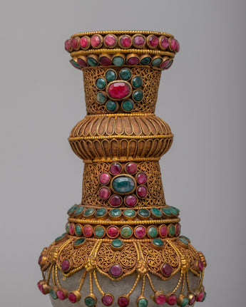 The Tibetan Gold Flower Vase Set is a magnificent example of traditional workmanship, delicately carved on copper and featuring intricate crystal stone inlays. Each vase is embellished with magnificent gemstones, lending an air of refinement and luxury to the design.