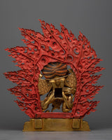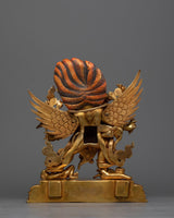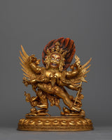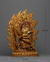 Our Vajrakilaya Gold Gilded Buddhist Statue is a masterpiece of exceptional craftsmanship. It is a magnificent depiction of the deity Vajrakilaya (Dorje Phurba), who is respected in Vajrayana Buddhism for his ability to eliminate impediments to enlightenment and fend off spiritual hindrances. Standing at 15.2 inches with a base of 13.8 inches, and weighing 5.78 kg, this statue is meticulously crafted from high-quality copper, adorned with 24K gold gilding, and enhanced with detailed gold and acrylic paintings. Its unique craftsmanship and spiritual depth make it a valuable and visually appealing addition to any collection.