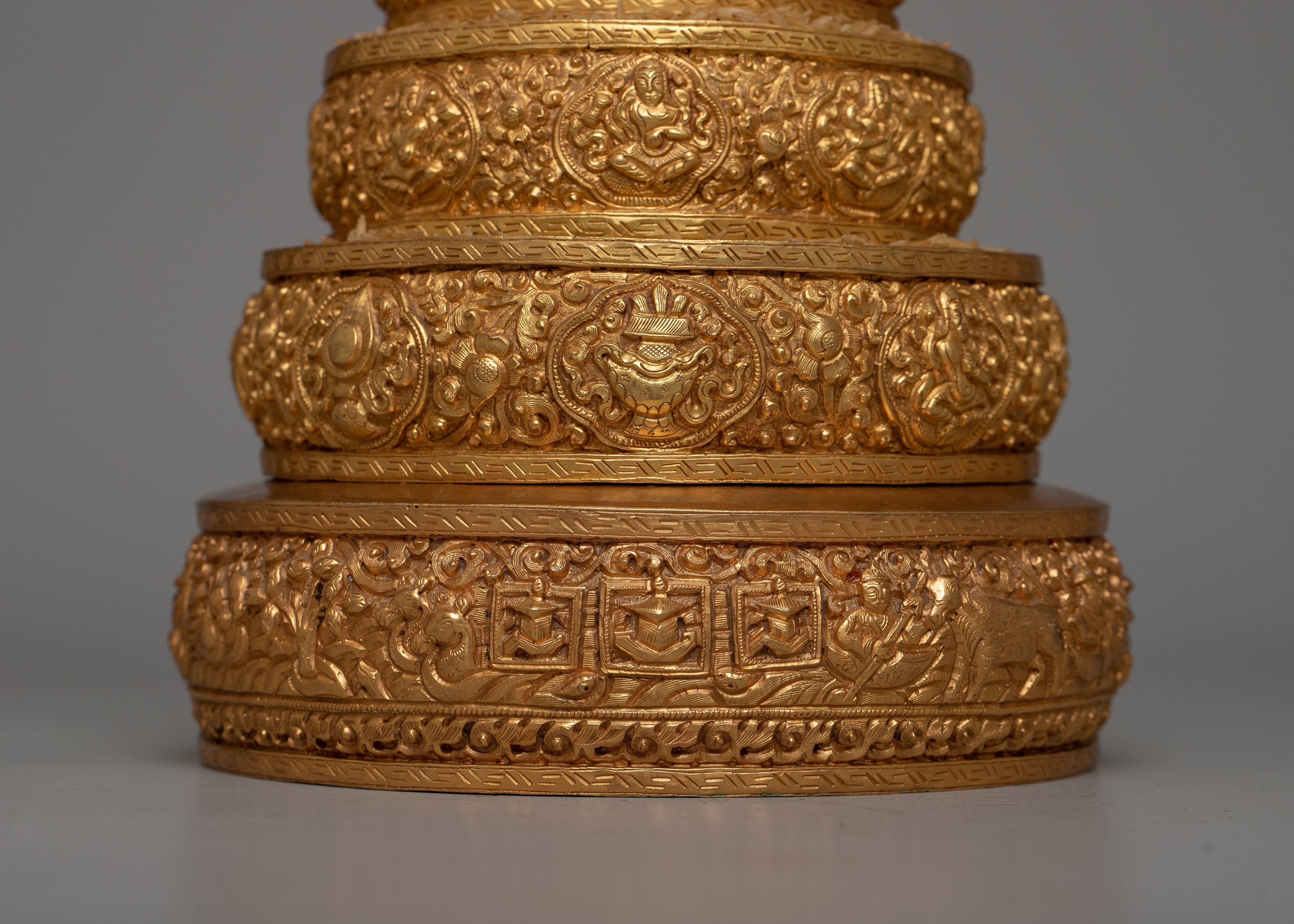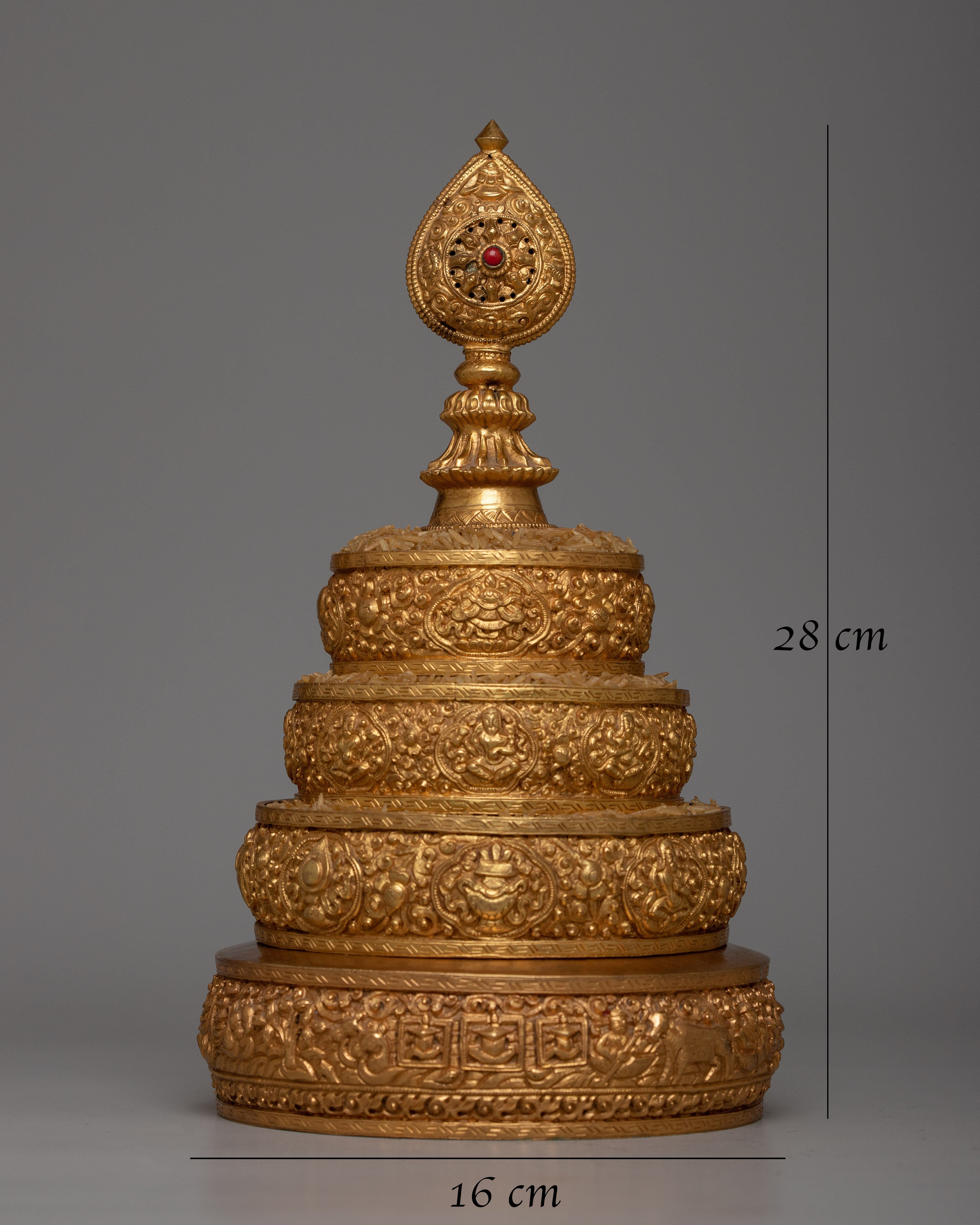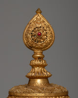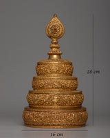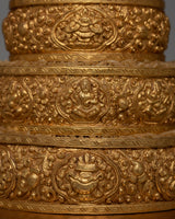 Presenting our Gold Mandala Offering Set, a work of artistic beauty and spiritual meaning. At a towering height of 28cm, this set is handcrafted on a copper body and embellished with the opulent shimmer of 24k gold electroplating.
