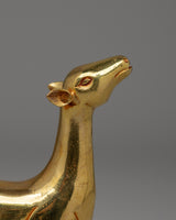 With this stunning gold-plated Dharma Wheel with Deer Set, you can elevate your spiritual practice. This respected Buddhist symbol, made by hand from a copper body and plated in gold, represents enlightenment and the Buddha's teachings. The connected 13-cm-tall deer represents the tranquil acceptance of dharma, while the 18-cm-tall Dharma Wheel is intricately detailed.