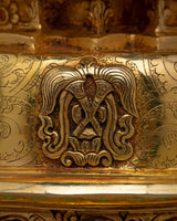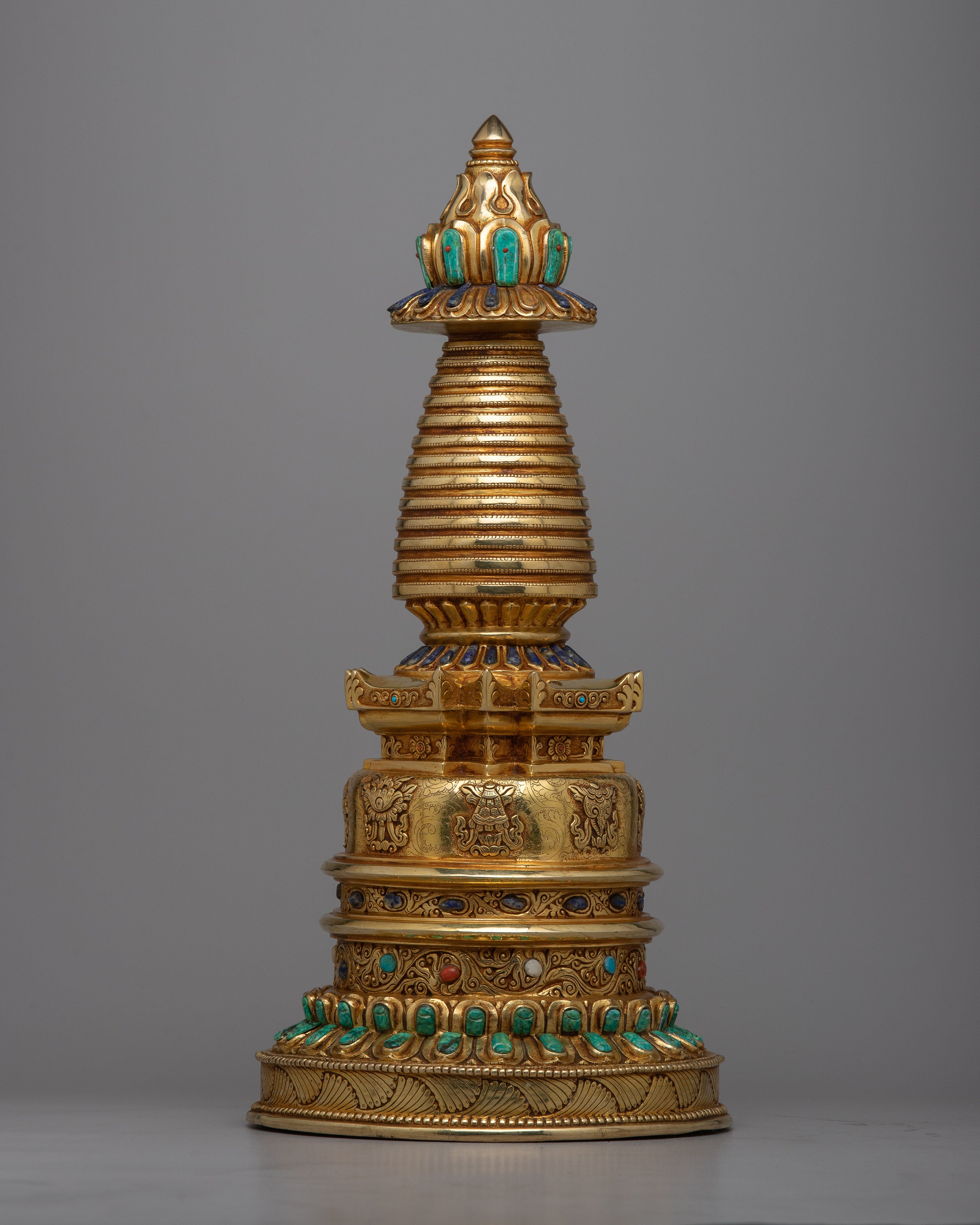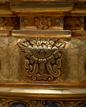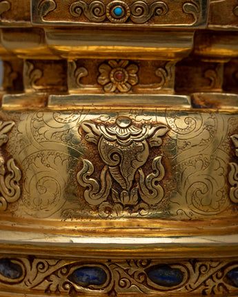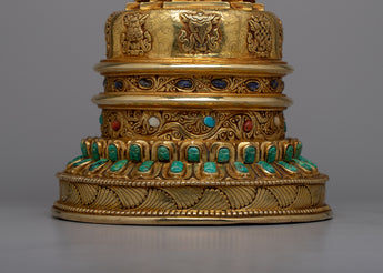 With our Gold Plated Kadampa Stupa, which is exquisitely constructed on a Copper body and adorned with opulent 24k Gold Plating , you may set forth on a voyage of exquisite elegance. With a solid base measuring 21 cm and a height of 45.5 cm, this stupa is more than just an ornament—rather, it is a profound symbol with spiritual significance.