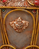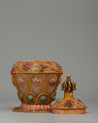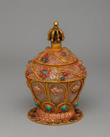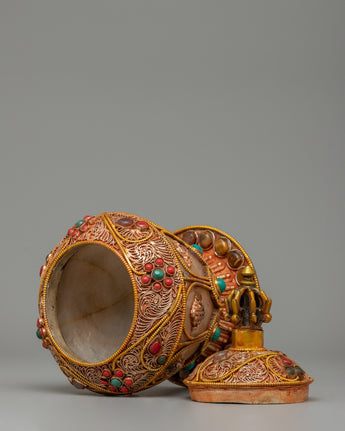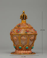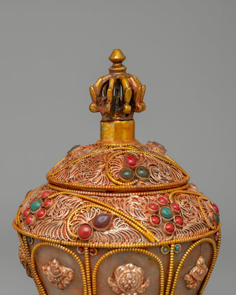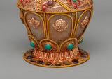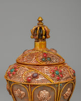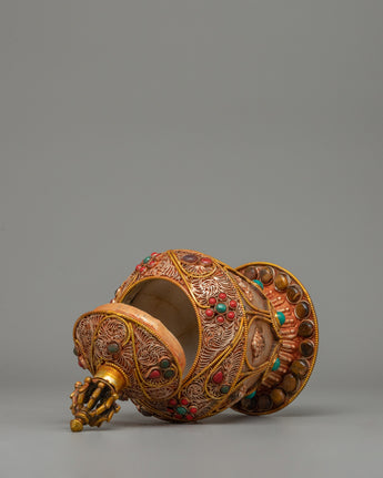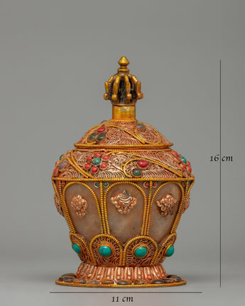 A stunning representation of traditional Himalayan creativity, this handcrafted gold-plated offering vessel for sacred spaces is designed for altar décor and spiritual offerings. Featuring beautiful filigree work and electro-gold plating, this vase weighs 0.95 kg and measures 16 cm in height by 11 cm in breadth. It is made of a copper body. This ritual vase, adorned with crystal and imitation coral and turquoise stones, exudes elegance and symbolic significance.