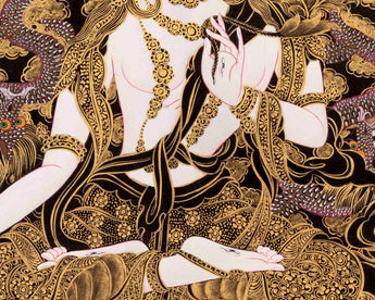 This Gold Style White Tara Thangka is the enchanting embodiment of kindness and elegance. In Tibetan Buddhism, White Tara is a highly respected goddess who is known for her compassion, wisdom, and healing abilities. The artwork is elevated by the addition of gold color, which gives it a heavenly shine that stands for enlightenment and purity. Given that White Tara is frequently worshipped for her capacity to extend life and enhance well-being, this hand-painted depiction serves as both a powerful spiritual talisman and a visual treat. Welcome White Tara's ageless calm and uplifting energy into your holy space as this piece of art serves as a source of inspiration and peace for you on your spiritual path.
