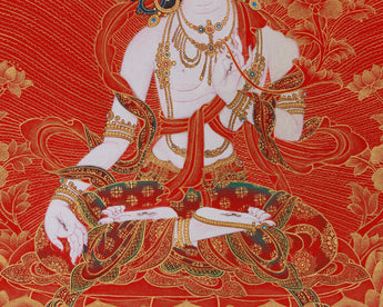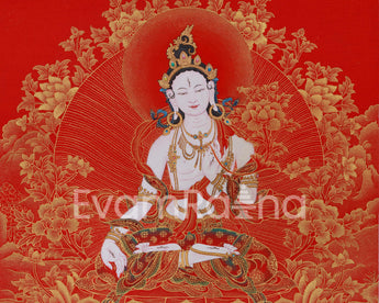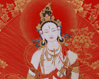 This beautiful Golden White Tara Goddess Thangka depicts the revered goddess, a symbol of compassion, healing, and protection. Known for her ability to bestow longevity, health, and peace, White Tara is a beloved figure in Tibetan Buddhism, often seen as the embodiment of the compassionate mother of all Buddhas. In this thangka, she is gracefully seated on a lotus flower, surrounded by intricate floral motifs representing her purity and wisdom.