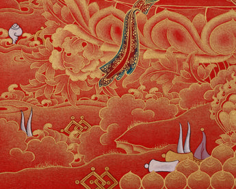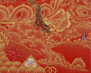 The colors used in the piece are acrylic, allowing the artist to achieve vibrant hues while maintaining the traditional beauty of Tibetan art. What makes this artwork even more special is the use of 24K gold, which is applied in the traditional Nakthang (Gold on Red) style. This technique highlights the rich gold detailing on a deep red background, accentuating the golden tones and making the goddess stand out in a divine and regal way.