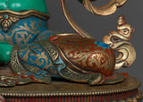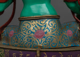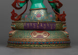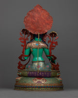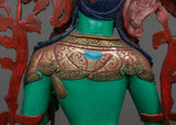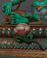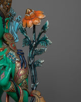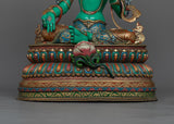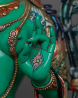 The magnificent Green Tara statue was created by knowledgeable craftspeople in Patan, Nepal. The statue's body is made of copper, guaranteeing its robustness and lifespan. Tara's enlightened nature is symbolized by the glorious brilliance added by the 24K gold gilding. Gold and acrylic paintings accentuate the minute details, emphasizing Green Tara's gentle features and calm demeanor. In keeping with Green Tara's original color, the statue is exquisitely painted in green acrylic, signifying her proactive compassion and willingness to assist those in need. Everything about this sacred piece—from the voluminous robes to the lotus pedestal—reflects the great care and skill that went into making it.