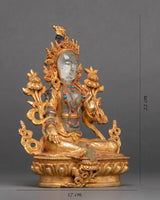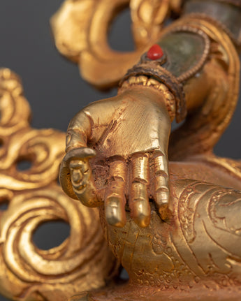Tara's most dynamic form is Green Tara. She is most frequently seen with her right leg outstretched in a relaxed pose, ready to jump into action. On the lotus pedestal, the left leg is folded in a thoughtful attitude, representing the fusion of knowledge and art. Her right hand is making the gesture of blessing while her left hand is making the sign of offering sanctuary. As a representation of power and purity, a lotus floats over her left and right shoulders.