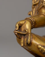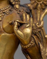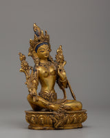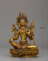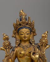 The statue's intricate details highlight its craftsmanship, while the flowing robes and elegant posture represent serenity and grace. The design also includes several symbolic elements, such as a multi-tiered crown, which represent Tara's divine qualities. Her face is serene, with gentle features that evoke kindness and empathy, reinforcing her role as a caring protector.