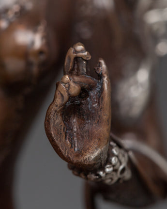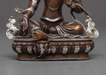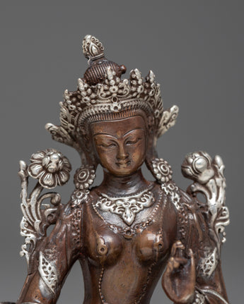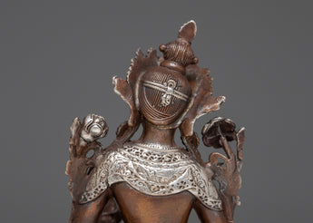 Presenting our Green Tara Machine Made Statue, a celestial representation of kindness and defense. With its finely crafted oxidized copper body and silver plating, this statue perfectly reflects the elegant demeanor of Green Tara. The figurine, which is 9.5 cm tall and is carefully crafted in every detail, depicts Tara's loving and sensitive nature.