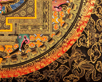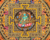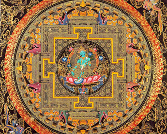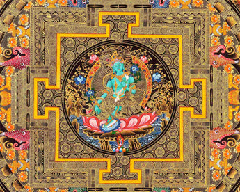 The Green Tara Mandala is a beautiful and intricate representation of the Buddhist goddess Green Tara, known for her compassion and swift assistance. At the center of the mandala, Green Tara is depicted seated on a lotus throne with a green complexion, symbolizing energy and vitality. Her right hand is in the gesture of giving, while her left hand, holding a blue lotus flower, is in the gesture of protection and fearlessness. The mandala is encased in concentric circles and lotus petals, symbolizing purity and the layers of the universe. It features four gates, guarded by protectors, representing the entry points into the sacred space. The outermost circle usually contains a ring of fire, signifying the burning away of ignorance, followed by a circle of vajras for spiritual power and another of lotus petals for purity.