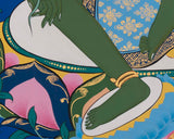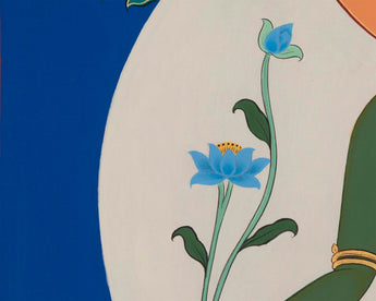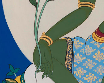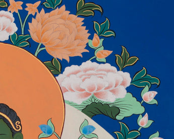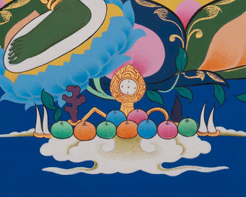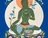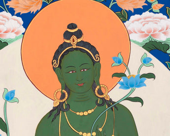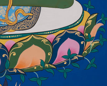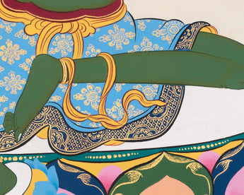 Our thangka is a handpainted Tibetan art done using traditional methods. It is a unique piece created using genuine 24K gold and natural stone colors.