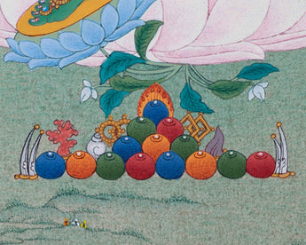 Experience the benevolent grace and swift compassion of Green Tara in this enchanting thangka painting. Mother of Liberation is a revered figure in Tibetan Buddhism, embodying the qualities of protection and healing. In this exquisite artwork, Green Tara sits majestically in a lotus seat, adorned with intricate jewelry and a crown that symbolizes her enlightened status. Her radiant green hue signifies her ever-ready nature to respond to calls for help and guidance swiftly. With her right hand extended to grant generosity and her left hand in the protective mudra,holding a blue utpala. Meticulously hand-painted with natural stone colors on cotton canvas, this sacred artwork preserves the essence of ancient traditions. Through meditation and reciting her mantra, "Om Tare Tuttare Ture Soha," one can invoke Green Tara's compassionate presence and cultivate spiritual growth, protection, and inner peace. Display this thangka in your home or meditation space to connect with the benevolent energy of Green Tara and invite her blessings into your life. Embrace the path of liberation and fearlessness under the watchful eye of Green Tara, the ever-compassionate Mother of Liberation.