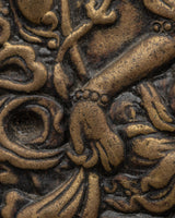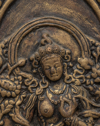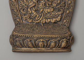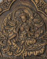 Our 22.5cm tall and 16.5cm wide Green Tara wall hanging statue is expertly crafted from terracotta, a material utilized in Buddhist art for centuries due to its earthy properties and deep connection to spiritual practices. Terracotta, also known as baked clay, is chosen for its durability and ability to add warmth to any religious area. The Green Tara monument is a strong symbol of compassion, protection, and healing. The statue's material choice also guarantees that it resonates with earth energy, making it an ideal addition to any altar or meditation area, providing a sense of grounding and connection with the holy.