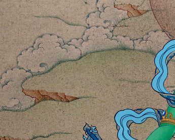 "Green Tara's Serene Blessings" is a profound masterpiece of Thangka art that pays homage to the compassionate goddess herself. Meticulously hand-painted on a canvas of pure cotton, it showcases Green Tara, the embodiment of compassion and protection, in vivid detail. This Thangka is a true testament to devotion and artistry, employing a palette of acrylic paints that bring her to life with vibrant hues. Embellished with genuine 24K gold accents, it radiates a divine aura. Green Tara's tranquil countenance exudes serenity and empathy, invoking a sense of profound peace. As you contemplate this masterpiece, you're invited to connect with the blessings of Green Tara, drawing upon her boundless compassion and protection to infuse your life with serenity and grace.