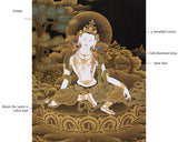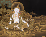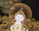 Discover serenity and compassion embodied in this exquisite Tibetan Avalokitesvara (Guanyin) art piece, adorned with meticulous 24K gold embellishments. Hand-painted on cotton black canvas, this sacred thangka captures the essence of Guanyin, the Bodhisattva of Compassion, revered across cultures for her boundless mercy and healing presence. Ideal for spiritual decor or as a meaningful gift, each brushstroke reflects devotion and skill, making it a treasured addition to any sacred space.
