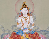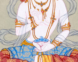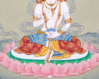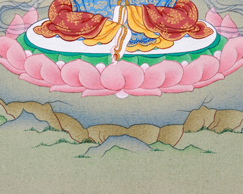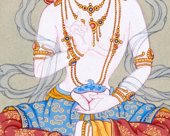 Elevate your spiritual space with this unique Guru Consort Yeshe Tsogyal Thangka, a distinguished piece of spiritual decor. This hand-painted artwork captures the essence of Yeshe Tsogyal, the revered consort of the Guru, embodying profound wisdom and sacred energy. The Thangka features traditional Tibetan techniques and is rendered in vibrant, refined colors using mineral pigments and genuine gold. Each detail is rendered with accuracy to honor its spiritual significance, making it an ideal centerpiece for meditation or reflection. Adorned with intricate patterns and set against a backdrop of rich, handcrafted cotton canvas, this Thangka serves as a timeless testament to Tibetan artistry and devotion. Enhance your meditation room with this exquisite representation of divine partnership and spiritual guidance.