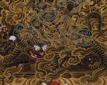 Guru Dorje Drolo is a powerful figure in Tibetan Buddhism, representing the protector and spiritual guide of Guru Rinpoche. He is often depicted riding a tiger, symbolizing his mastery over worldly illusions and uncontrolled forces. His expression is fierce yet compassionate, reflecting both protection and boundless wisdom. He holds a vajra (thunderbolt) and a phurba (ritual dagger), symbolizing spiritual power and destruction of negative influences. His flames of wisdom and transformation surround him, emphasizing his role as a guardian of sacred teachings and spiritual treasures.