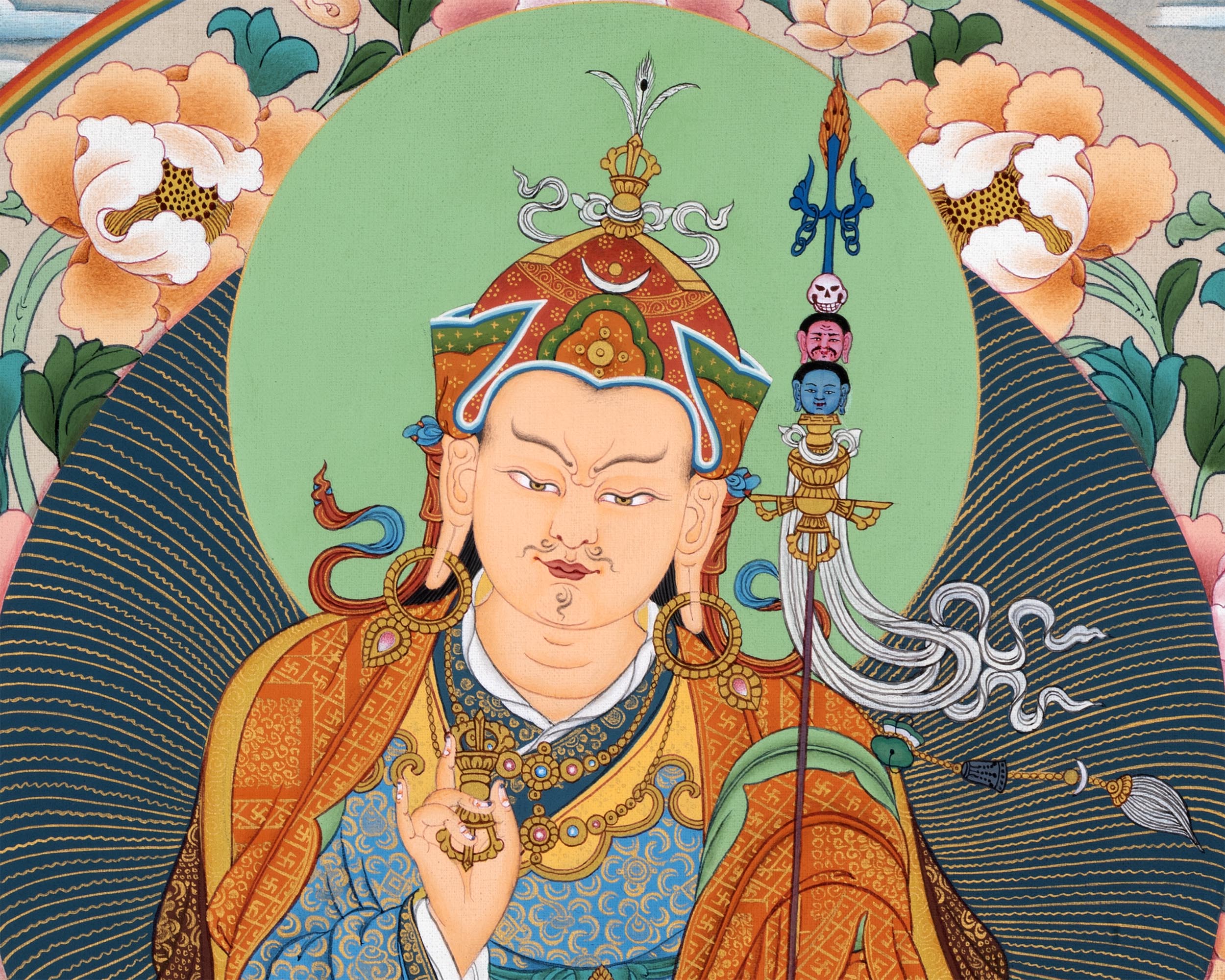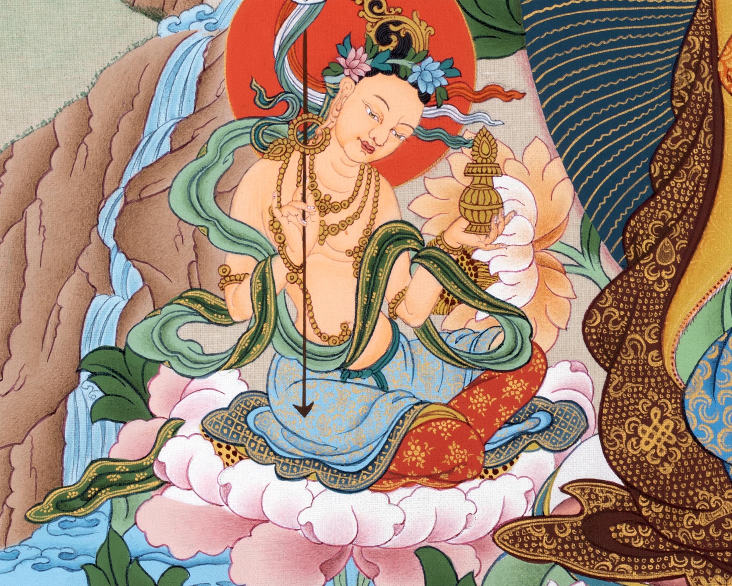 Guru Padmasambhava appears youthful as he is beyond the realm of aging or decay. His loving and powerful eyes are wide open symbolizing that he looks after all sentient beings with his omniscient wisdom, unconditional love and boundless power. He wears a Lotus-hat of five petals which represents the empowerment of all the Five Classes of Buddhas. The "Lotus-born" is called so because he was born miraculously in a lotus without human parents, Twelve years after the Mahaparinirvana of the Buddha.